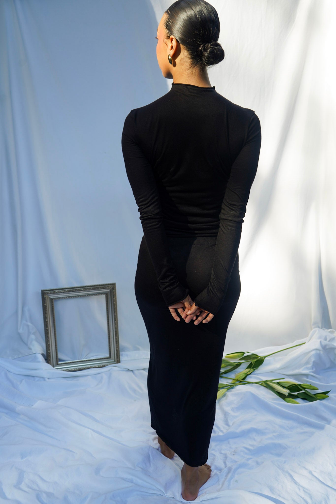- Floor-length, body-skimming silhouette