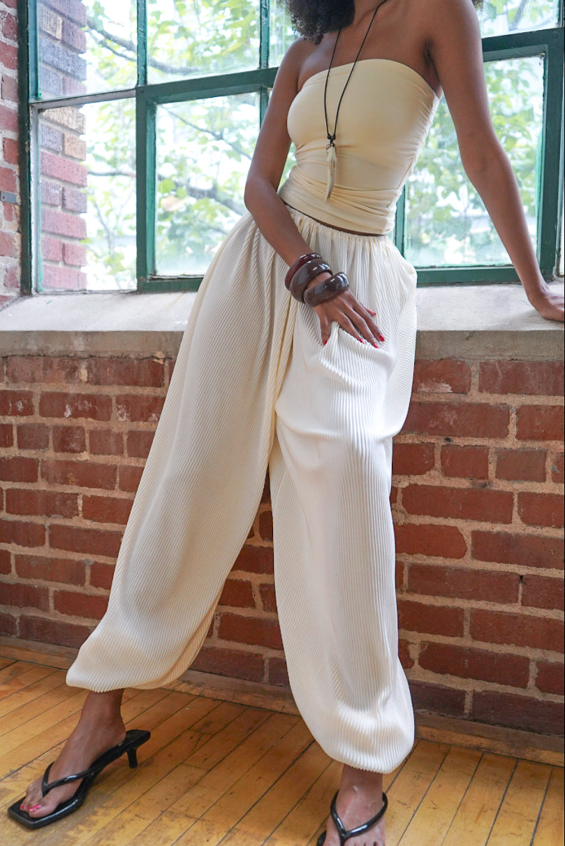 Make a statement in the Jade Balloon Pants, designed in airy pleated plissé fabric for effortless movement and sculptural shape. Featuring a dramatic balloon-leg silhouette with pockets, elasticized cuffs and waistband, these pants combine comfort with high-impact style. The lightweight plissé texture adds depth and flow, while the relaxed fit makes them perfect for both elevated daywear and evening dressing. Versatile enough to pair with a sleek crop top, oversized knit, or matching plissé pieces, the Jade Balloon Pants deliver modern elegance with an artful twist.